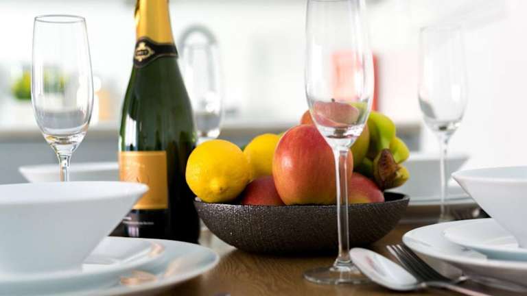 Jede Wohneinheit ist mit einer voll ausgestatteten Küche und einem Esstisch ausgestattet. Es stehen Kühlschrank, Geschirrspüler, Ofen, Kaffeemaschine und Wasserkocher zur Verfügung.