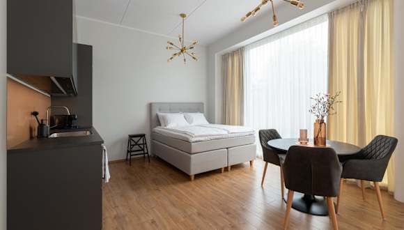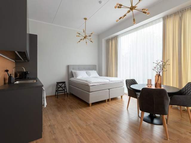 Das Studio beinhaltet ein Schlafzimmer, eine Küche mit Kühlschrank und Geschirrspüler, einen Flachbild-TV sowie einen Sitzbereich. Das Badezimmer ist mit einer Dusche ausgestattet und es werden Handtücher und Bettwäsche bereitgestellt.
