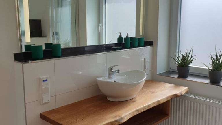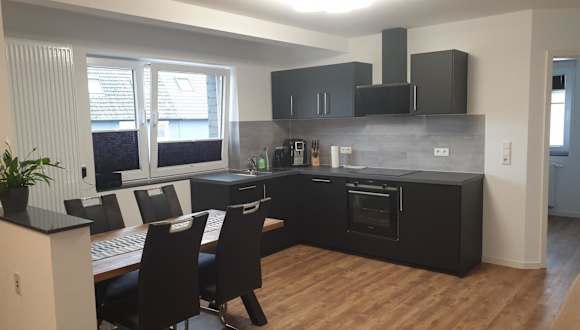 In der Ferienwohnung befindet sich eine voll ausgestattete Küche, die mit einem Kühlschrank, einem Geschirrspüler, einem Ofen, einer Kaffeemaschine und einem Wasserkocher ausgestattet ist. Ein Esstisch ist ebenfalls vorhanden, um die Mahlzeiten in der eigenen Unterkunft zu genießen.