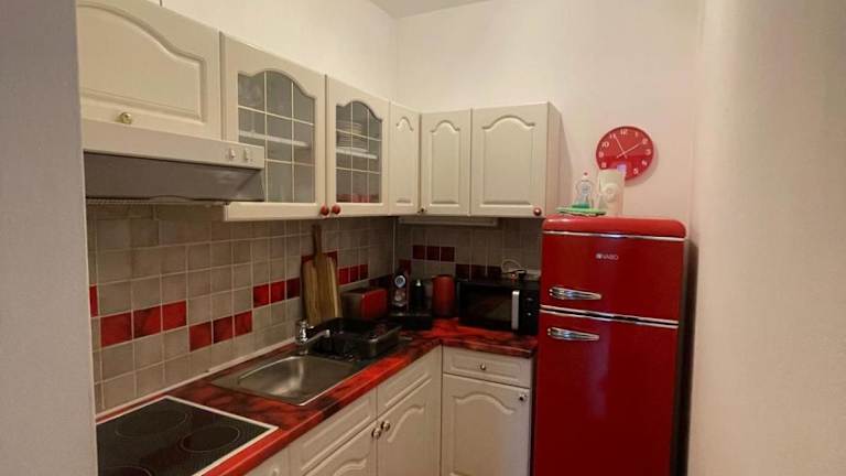 Die Ferienwohnung ist mit einer voll ausgestatteten Küche sowie einem Kühlschrank und einem Ofen ausgestattet. Es liegen keine Informationen über spezifische Verpflegungsmöglichkeiten vor.