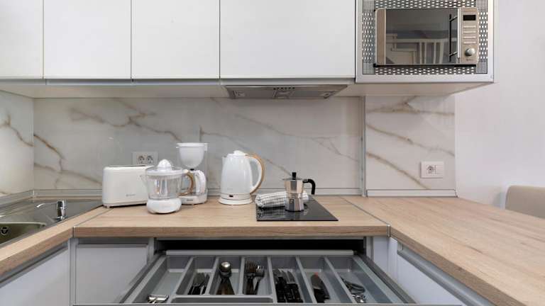 Die Unterkunft besteht aus einem Schlafzimmer, einem Wohnzimmer und einer voll ausgestatteten Küche mit Kühlschrank und Kaffeemaschine. Es gibt ein Badezimmer mit Dusche und kostenlosen Pflegeprodukten. Handtücher und Bettwäsche werden bereitgestellt. Klimaanlage ist ebenfalls vorhanden.