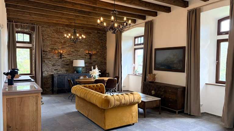 Das Kutscherhaus auf Burg Coraidelstein bietet eine gemütliche Villa mit 1 Schlafzimmer und 1 Badezimmer. Die Villa ist geschmackvoll eingerichtet und verfügt über Bettwäsche, Handtücher, einen Flachbild-TV und einen Essbereich. Eine voll ausgestattete Küche ermöglicht es den Gästen, ihre eigenen Mahlzeiten zuzubereiten. Von der Terrasse aus haben Sie einen wunderschönen Blick auf den Fluss.