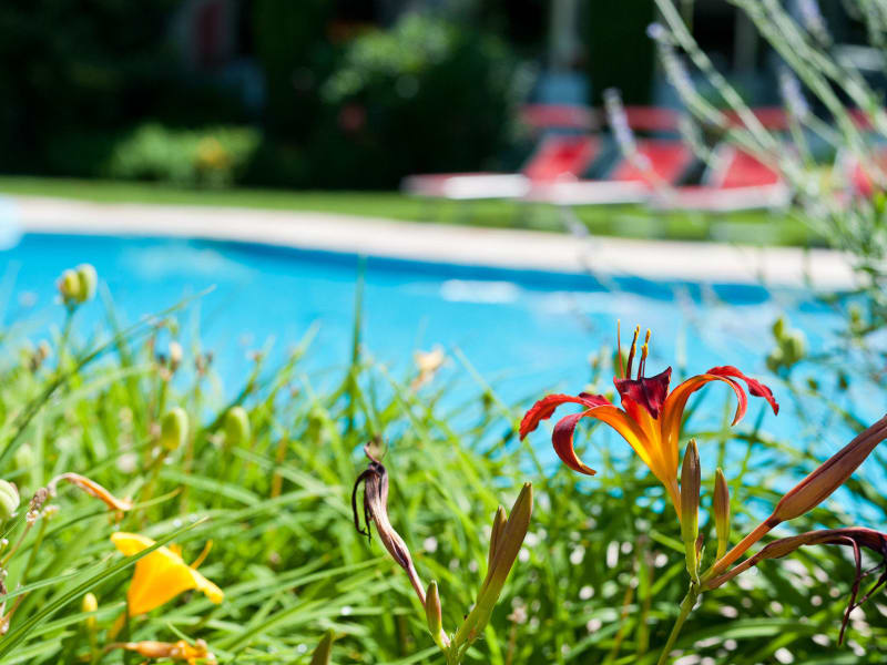 Das Hotel verfügt über einen mediterranen Garten mit einem saisonalen Außenpool und einer Sonnenterrasse, auf der Gäste ein Getränk von der Bar genießen können.