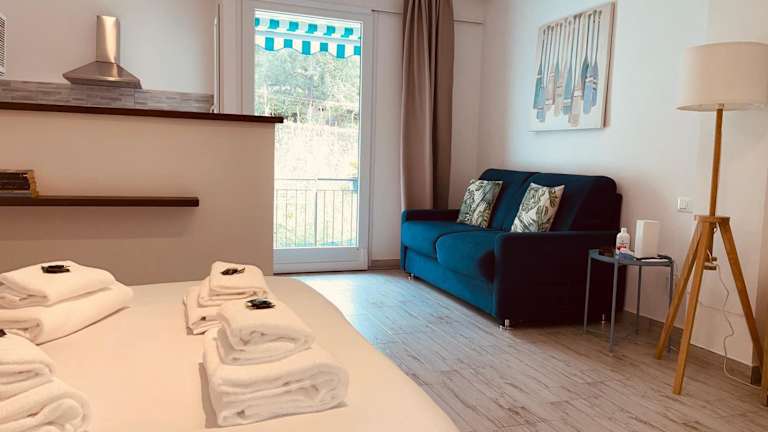 Die Ferienwohnung umfasst ein Schlafzimmer, ein Wohnzimmer und eine voll ausgestattete Küche, die mit einem Kühlschrank und einer Kaffeemaschine versehen ist. Des Weiteren gibt es ein Badezimmer mit Bidet und Dusche. Handtücher und Bettwäsche sind im Angebot enthalten.