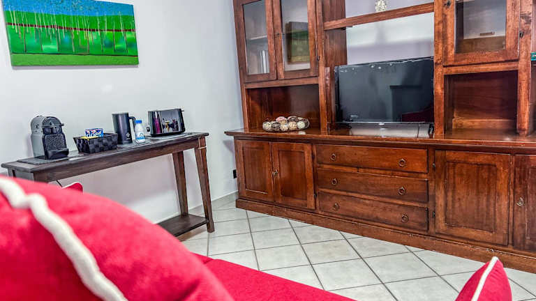 Das Ferienhaus umfasst ein Schlafzimmer und ist mit einer voll ausgestatteten Küche ausgestattet. Diese bietet einen Kühlschrank und einen Geschirrspüler. Des Weiteren sind ein Flachbild-TV, ein Sitzbereich sowie ein Badezimmer mit Bidet vorhanden. Handtücher und Bettwäsche stehen bereit.