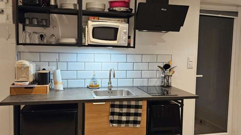 Die Ferienwohnung ist mit einer voll ausgestatteten Küche ausgestattet, die es den Gästen ermöglicht, eigene Mahlzeiten zuzubereiten. Keine Informationen zu weiteren Verpflegungsmöglichkeiten vorhanden.