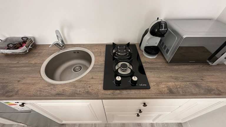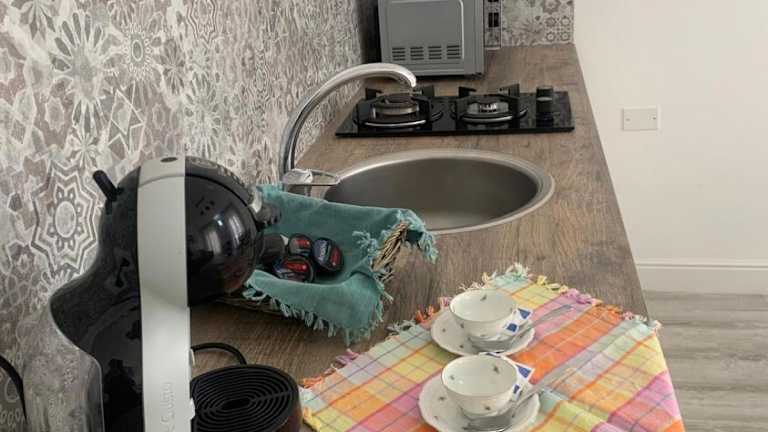 Die Unterkunft verfügt über eine voll ausgestattete Küche mit einem Essbereich, einem Kühlschrank, einer Mikrowelle und einer Kaffeemaschine.