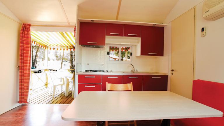 Die Mobilheime im Happy Camp mobile homes in Camping Bi Village sind komfortabel und gut ausgestattet. Jedes Mobilheim verfügt über eine halb überdachte Terrasse, einen gemütlichen Sitzbereich und einen Essbereich. Die voll ausgestattete Küchenzeile bietet Ihnen die Möglichkeit, Ihre eigenen Mahlzeiten zuzubereiten. Das eigene Bad ist mit einer Dusche ausgestattet.