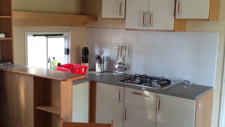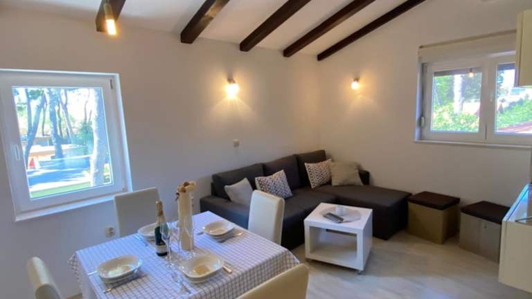 Die Mobilheime im Camping Biograd sind klimatisiert und bieten eine komfortable Unterkunft für Ihren Aufenthalt. Jedes Mobilheim verfügt über eine voll ausgestattete Küche und einen Essbereich, in dem Sie Ihre Mahlzeiten zubereiten und genießen können. Die geräumige Terrasse lädt zum Entspannen im Freien ein.
