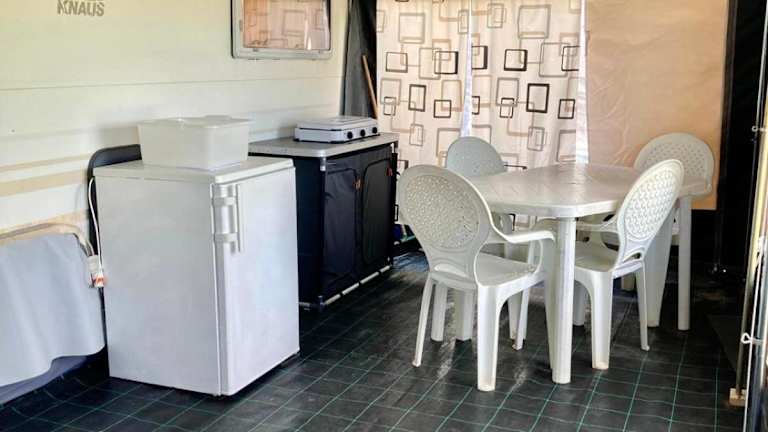 Die Unterkunft bietet gemütliche Wohnwagen mit einer Küchenzeile, die mit einem Kühlschrank und Küchenutensilien ausgestattet ist. Die Gäste nutzen ein Gemeinschaftsbad, das sich in der Nähe der Wohnwagen befindet. Für zusätzlichen Komfort bietet das Camping Cala d'Ostia kostenfreie Privatparkplätze.