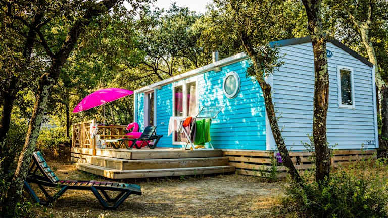Die Unterkünfte im Camping la Sousta **** bieten eine voll ausgestattete Küchenzeile sowie eine Terrasse und einen gemütlichen Sitzbereich. Das eigene Bad umfasst eine Dusche.
