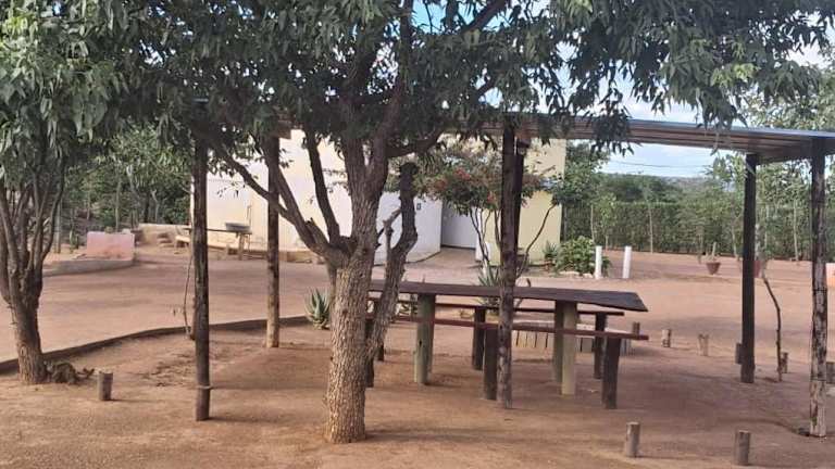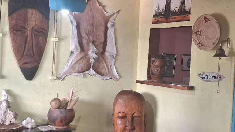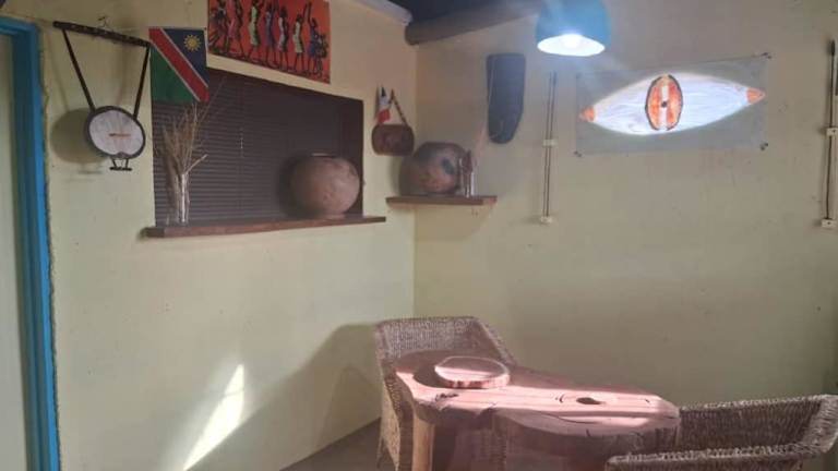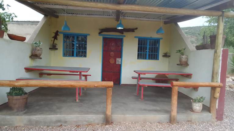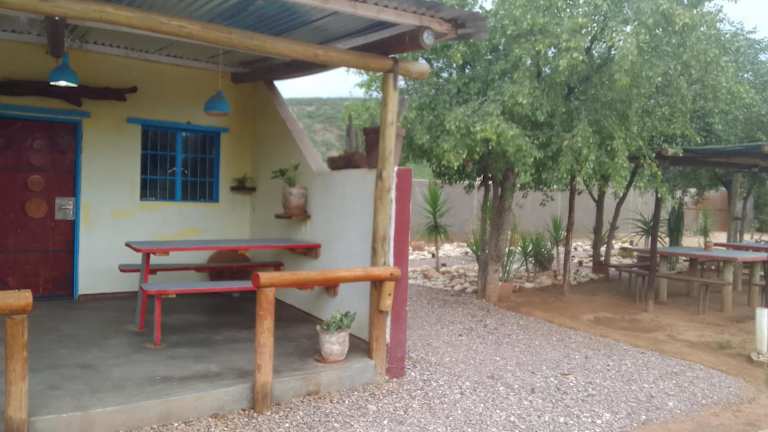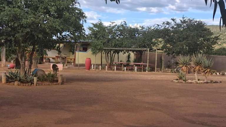 Opuwo, umgeben von einem Garten mit Terrasse.