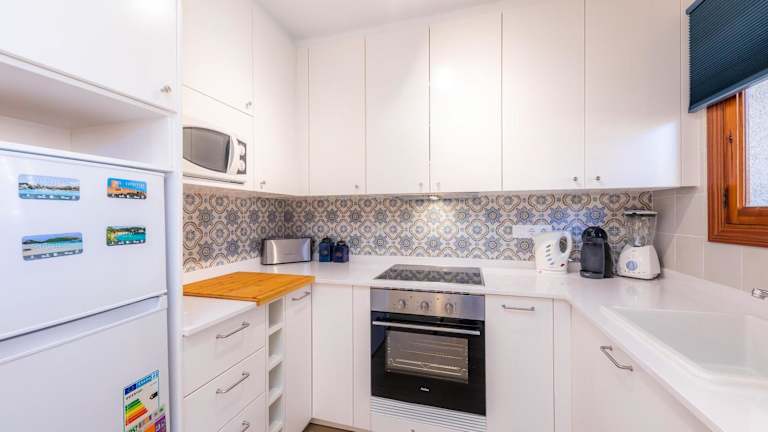 Die klimatisierten Übernachtungsmöglichkeiten im Ferienhaus umfassen zwei Schlafzimmer, eine voll ausgestattete Küche mit einem Kühlschrank und einem Ofen sowie ein Badezimmer mit Dusche und kostenlosen Pflegeprodukten. Zur Ausstattung gehören weiterhin kostenloses WLAN, eine Waschmaschine sowie Handtücher und Bettwäsche. Die Gäste können zudem einen Balkon nutzen.