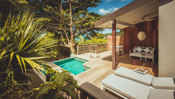 Eine neue Perspektive der kolonialen Inselarchitektur: Unsere Chalets unterstreichen die unberührte und wilde Landschaft, in die das Hotel eingebettet ist. Die gedämpften Grautöne und sanften Erdfarben der Innenräume bilden einen gelungenen Kontrast zu der herrlichen Aussicht, die man von jedem Chalet aus hat. Jedes Chalet bietet modernen Komfort mit elegant rustikalen Akzenten, die vom Meer beeinflusst sind: Alles ist perfektioniert - vom gealterten Treibholz bis hin zu beschliffenen Korallen. Kategorie 1: Chalets mit Meerblick - 45 m² Zimmerausstattung: o KOSTENLOSES WIFI o Telefon o LED-Bildschirm mit Satellitenfernsehen o Voll klimatisiert o Deckenventilator o Zimmersafe o Minibar Kühlschrank o Tee- und Kaffeestation o Offene Terrasse mit Lounges o Haartrockner o Nespresso-Maschine o Geräumiges Badezimmer mit separatem Waschtisch und Dusche o Zimmerservice verfügbar Kategorie 2: Ocean View Pool Chalets - 60 m 2 Zimmerausstattung: o KOSTENLOSES WIFI o Telefon o LED-Bildschirm mit Satellitenfernsehen o Voll klimatisiert o Deckenventilator o Zimmersafe o Minibar Kühlschrank o Tee- und Kaffeestation o Offene Terrasse mit Lounges o Haartrockner o Nespresso-Maschine o Geräumiges Badezimmer mit separatem Waschtisch und Dusche o Privater Plunch-Pool o Zimmerservice verfügbar