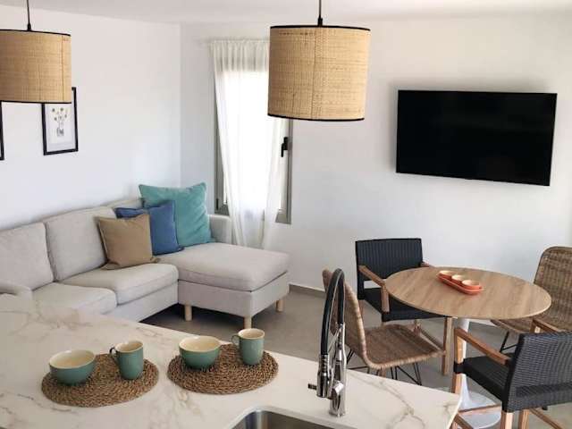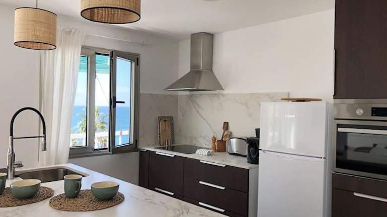 Die Ferienwohnung verfügt über einen Balkon mit Meerblick, zwei Schlafzimmer, ein Wohnzimmer, einen Flachbild-TV sowie eine gut ausgestattete Küche mit Kühlschrank und Geschirrspüler. Zur Ausstattung gehört zudem ein Badezimmer mit Dusche. Handtücher und Bettwäsche werden bereitgestellt. Die Unterkunft bietet Nichtraucherzimmer und Familienzimmer.