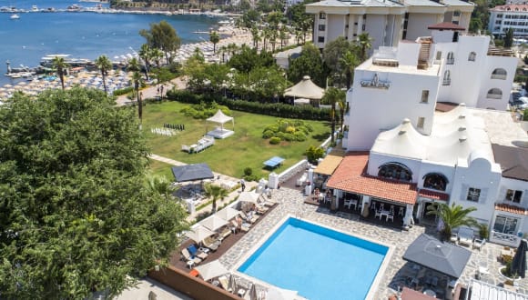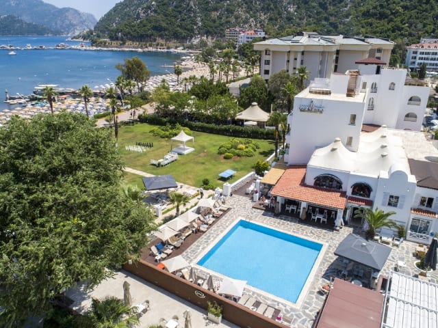 Das Hotel Casa Blanca in Içmeler ist ein Strandhotel an der wunderschönen türkischen Ägäisküste. Es besticht durch seine zentrale Lage, nur ca. 200 m vom Zentrum von Içmeler entfernt, wo Sie eine Vielzahl von Restaurants, Bars, Nachtclubs, Geschäften und den Busbahnhof finden. Der Strand liegt nur etwa 10 m vom Hotel entfernt. Das Hotel bietet eine Vielzahl von Annehmlichkeiten, darunter ein Innen- und Außenpool, ein Wellnessbereich mit Sauna und Spa, ein Fitnessraum, verschiedene Sportmöglichkeiten und eine Disco. Die Zimmer sind komfortabel eingerichtet und verfügen über Annehmlichkeiten wie eine Klimaanlage, einen Balkon oder eine Terrasse mit Meerblick und kostenfreies WLAN.
