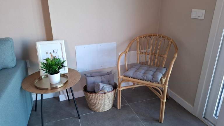 Das Ferienhaus beinhaltet ein Schlafzimmer, eine Küche ausgestattet mit Kühlschrank und Ofen, ein Badezimmer mit Dusche, einen Sitzbereich und einen Flachbild-TV. Handtücher und Bettwäsche sind ebenfalls vorhanden.