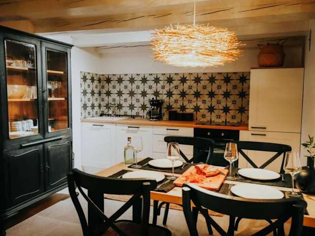 Die Ferienwohnung umfasst ein separates Schlafzimmer, ein Wohnzimmer, eine voll ausgestattete Küche mit Kühlschrank und Ofen sowie ein Badezimmer. Handtücher und Bettwäsche werden bereitgestellt. Eine Terrasse ist ebenfalls vorhanden.