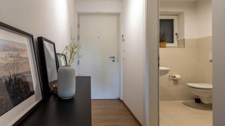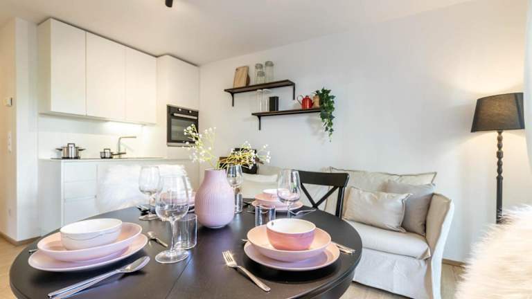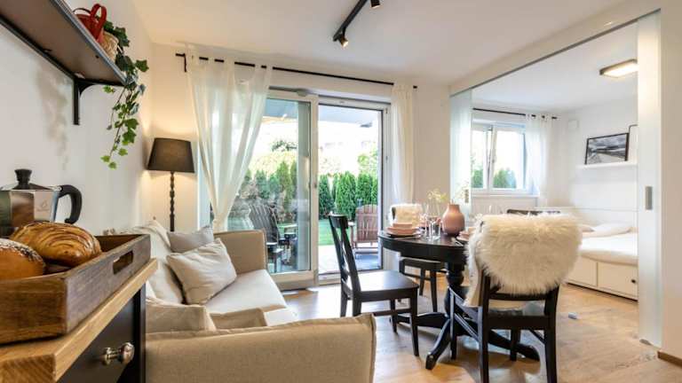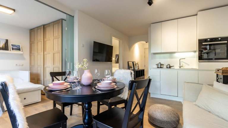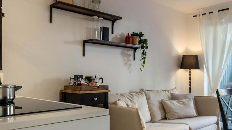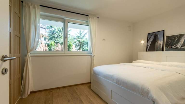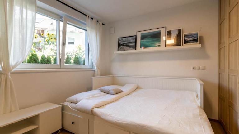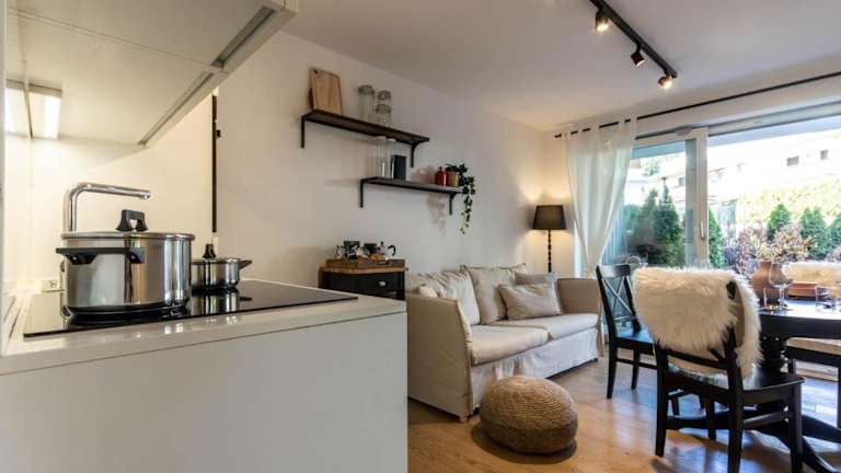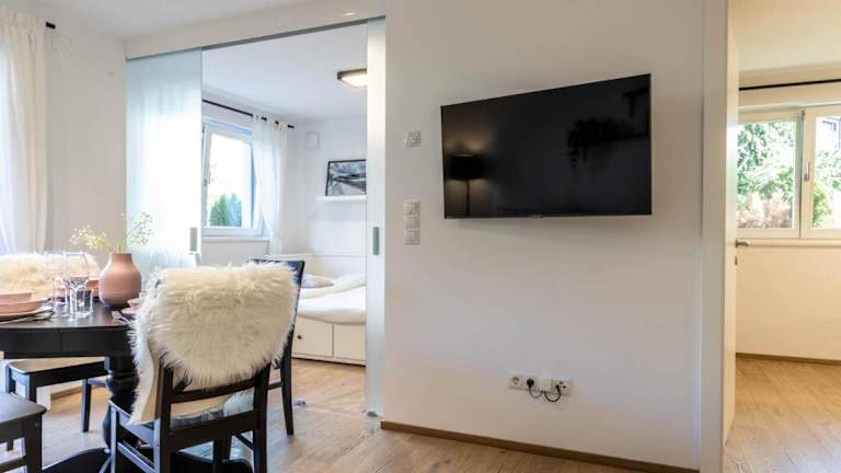 Die Ferienwohnung beinhaltet ein Schlafzimmer sowie ein Wohnzimmer, das mit einem Flachbild-TV mit Satellitenkanälen ausgestattet ist. Eine voll ausgestattete Küche mit Kühlschrank und Geschirrspüler steht ebenfalls zur Verfügung. Das Badezimmer ist mit einem Bidet eingerichtet. Handtücher und Bettwäsche werden bereitgestellt.