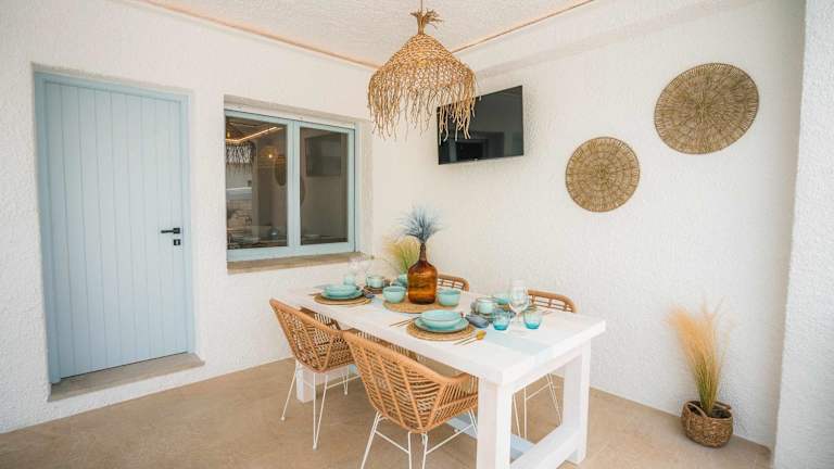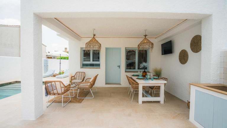 Das Ferienhaus ist klimatisiert und verfügt über zwei Schlafzimmer sowie einen Flachbild-TV. Ein Essbereich ist vorhanden und die Küche ist mit einem Kühlschrank und Geschirrspüler ausgestattet. Handtücher und Bettwäsche werden bereitgestellt.