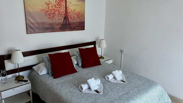 Das Ferienhaus umfasst zwei Schlafzimmer, ein Wohnzimmer und zwei Badezimmer mit Dusche. Zur Ausstattung gehören ein Flachbild-TV, eine gut ausgestattete Küche mit Kühlschrank und Ofen sowie ein Balkon mit Stadtblick. Handtücher und Bettwäsche werden bereitgestellt.
