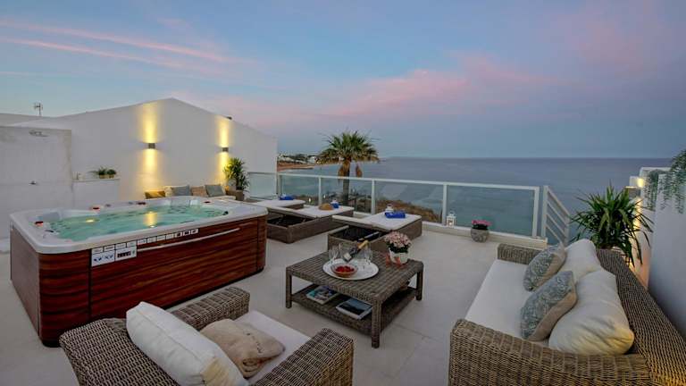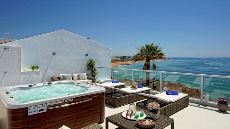 Die Casa Latino - Oceanfront - Luxury & Charming villa- Jacuzzi at Rooftop by DreamvillasAlbufeira ist eine luxuriöse Unterkunft direkt am Strand. Sie bietet Zugang zu einer Veranda/Patio und kostenloses WLAN. Die Unterkunft zeichnet sich durch ihre charmante Gestaltung aus und verfügt über einen Whirlpool.