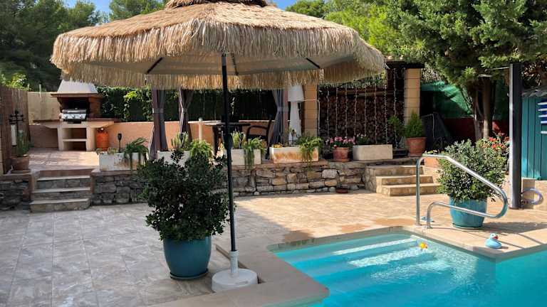 In der Umgebung der Unterkunft können die Gäste Aktivitäten wie Wandern und Fahrradfahren nachgehen. Das Ferienhaus selbst bietet einen Außenpool und eine Terrasse.