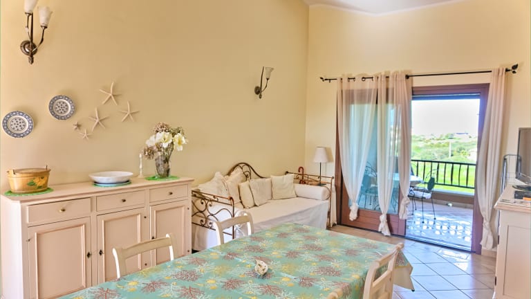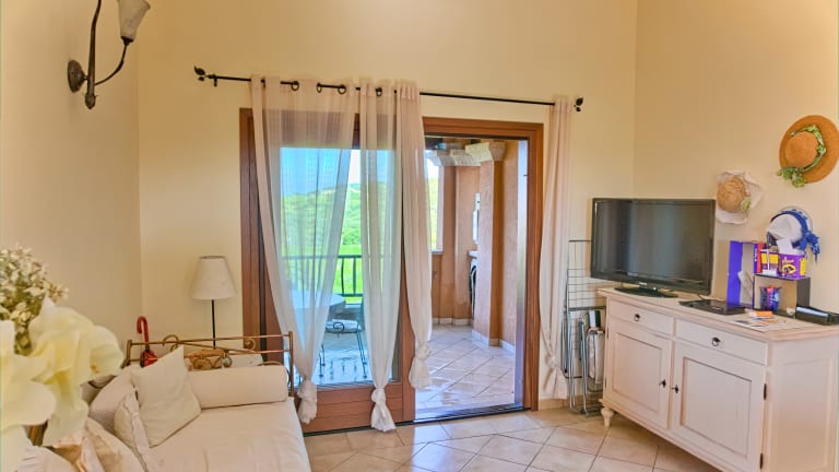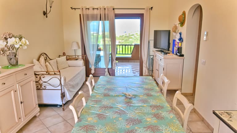 Diese sehr schöne Wohnung liegt in einer kleinen und gepflegten Residence am Rand des Ortskern von Golfo Aranci. Über den zentralen Gemeinschaftbereich mit Pool gelangt man über eine Treppe in die im ersten Obergeschoß gelegene Wohnung. Diese verfügt über einen hellen Wohn-/Essbereich mit bequemen Sitzgelegenheiten und einer Küchenzeile. Ein kleiner Flur führt zu den beiden Schlafzimmern mit Doppelbett und das zentrale Bad mit Dusche. Die Wohnung ist mit einer Klimaanlage ausgestattet und verfügt über eine Waschmaschine. Auf der nach Westen ausgerichteten Veranda mit Blick ins Grüne, können Sie bei einem Aperitiv die Abendsonne genießen und den Tag ausklingen lassen. Die Residence verfügt über einen Gemeinschaftspool mit 2 Schwimmbecken unterschiedlicher Tiefe und kann kostenfrei genutzt werden. Kostenlose Parkmöglichkeiten sind vor der Anlage in ausreichender Anzahl vorhanden. Der schöne Ortskern von Golfo Aranci mit zahlreichen Restaurants und Geschäften ist nur ca. 150m von der Wohnung entfernt und bequem zu Fuß erreichbar. Der nächstgelegene Strand liegt ca. 500m entfernt und ist ebenfalls fussläufig erreichbar. Golfo Aranci ist eine rund 2500 Einwohner zählende Gemeinde ca. 20 Autominuten nordöstlich von Olbia, direkt am Meer gelegen. In den zahlreichen Restaurants im Ort finden Sie eine hervorragende mediterrane Küche - insbesondere frische Fischgerichte, sardische Spezialitäten und exzellente Weine aus der Region. Geschäfte des täglichen Bedarfs finden Sie ebenfalls direkt im Ort. Neben zwei kleinen Supermärkten, mehreren Obst- und Gemüseläden, gibt es zwei Bäckereien, sowie vier Fisch-Geschäfte mit einem täglichen Angebot an frischem Fisch und Meeresfrüchten.