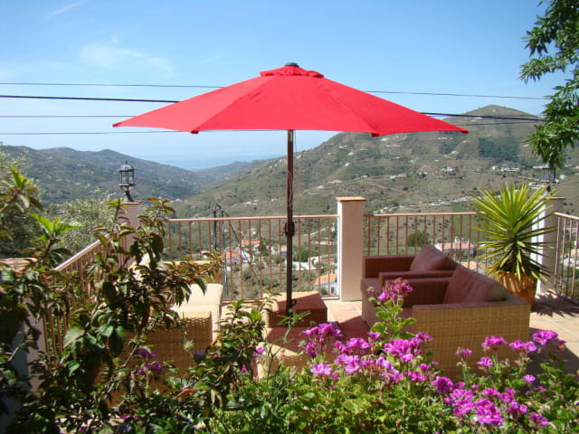 Im Wohnzimmer werden Sie einen offenen Kamin und hinter dem roten, chinesischen Hochzeitsschrank den Fernseher (dt. SAT-TV) und eine Stereoanlage mit CD-Player vorfinden. Für die kältere Jahreszeit sorgt neben dem Kamin auch eine Marmorheizung für angenehme Wärme Die Küche ist neben einer Spülmaschine, einem Ceranfeldherd, einem großen Kühlschrank mit separatem Gefrierfach, einer Kaffemaschine und einem Wasserkocher mit allem augestattet, was Sie für einen angenehmen Urlaub benäötigen. Hinter der Küche befindet sich ein kleiner Abstellraum, von dem aus man in das Einzelschlafzimmer gelangt. Im Abstellraum steht die Waschmaschine, die Mikrowelle, der Staubsauger und auch das Bügeleisen mit Bügelbrett. Insgesamt gibt es drei Schlafzimmer; eines mit einem Doppelbett, eines mit zwei Einzelbetten und eines mit einem Einzelbett. In allen Schlafzimmern gibt es neben Kleiderschränken auch Elektro- bzw. Marmorheizungen. In zwei der drei Schlafzimmer wurden Anfang 2010 neue Klimaanlagen installiert. Vor der Eingangstüre gibt es einen Wintergarten, in dem es sich vor allem an den wenigen kälteren Tagen besonders angenehm speisen läßt. Der Blick von der Terrasse auf das Mittelmeer und die Bergwelt der Axarquía ist wirklich sehenswert. Vor dem Haus gibt es seit Ende Oktober noch ein kleines überdachtes Plätzchen, wo man vor allem im Sommer im Schatten sein Mittagsschläfchen abhalten kann. Selbstverständlich gibt es auch einen Grill, der Ihnen für gemütliche Grillabende zur Verfügung steht. Die verschiedenen Sitzgelegenheiten bieten den Gästen die Möglichkeit auch ein wenig Abstand voneinander zu halten.