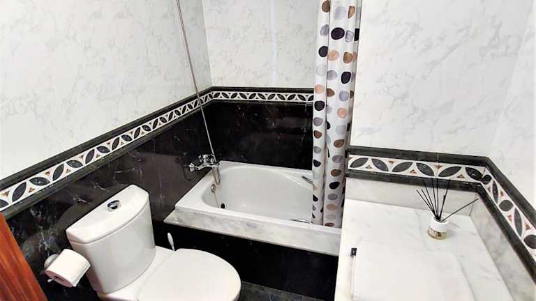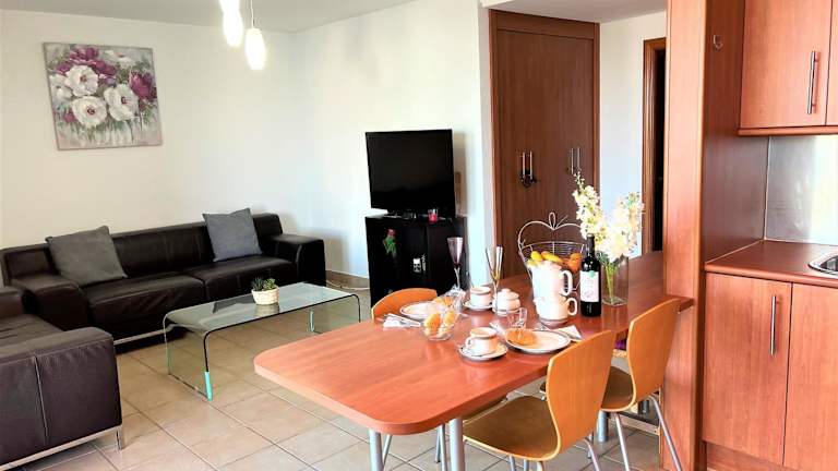 Die Ferienwohnung besteht aus zwei Schlafzimmern, einem Wohnzimmer sowie einer voll ausgestatteten Küche mit Kühlschrank und Kaffeemaschine. Zur Ausstattung gehören zwei Badezimmer mit Dusche und Badewanne. Handtücher und Bettwäsche werden bereitgestellt, und die Unterkunft bietet einen Balkon.