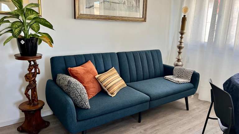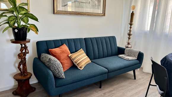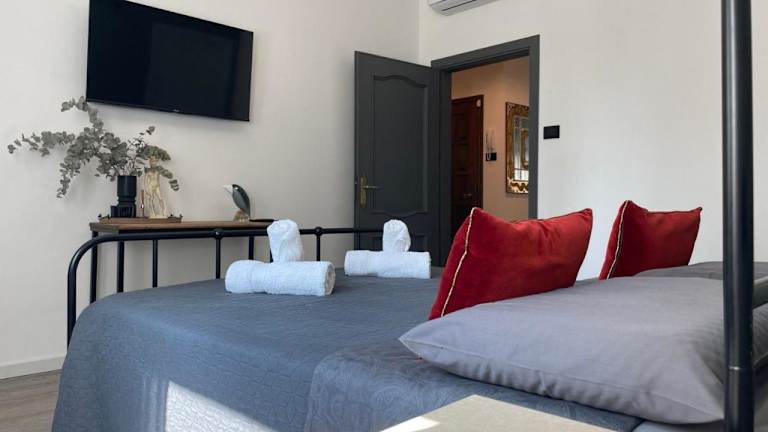 Die Ferienwohnung verfügt über eine Klimaanlage und besteht aus zwei Schlafzimmern, einem Wohnzimmer und einer voll ausgestatteten Küche. Die Küche enthält einen Kühlschrank und eine Kaffeemaschine. Es gibt ein Badezimmer, das mit einem Bidet und einer Dusche ausgestattet ist. Handtücher und Bettwäsche werden bereitgestellt.