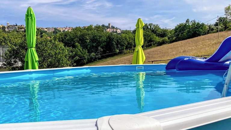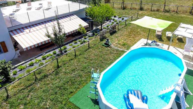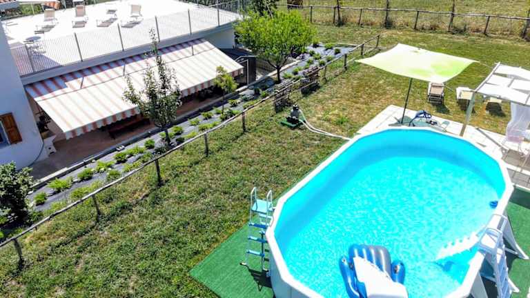 Die Unterkunft verfügt über einen Außenpool, der saisonal genutzt werden kann. Für Familien gibt es einen Bereich mit Außenspielgeräten und eine Sonnenterrasse mit Liegen und Sonnenschirmen.