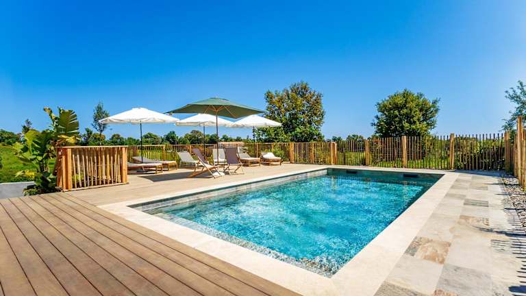 Die Ferienwohnung verfügt über ein Schlafzimmer und ein Badezimmer und ist ausgestattet mit Bettwäsche, Handtüchern, einem Flachbild-TV sowie einer voll ausgestatteten Küche. Zur Unterkunft gehört außerdem eine Terrasse mit Gartenblick und es stehen Sonnenstühle und Sonnenschirme zur Verfügung. Ein eigener Pool und ein Garten sind ebenfalls vorhanden.