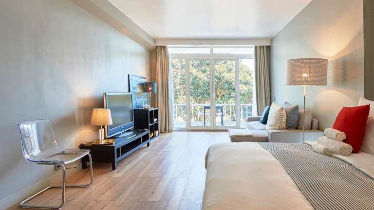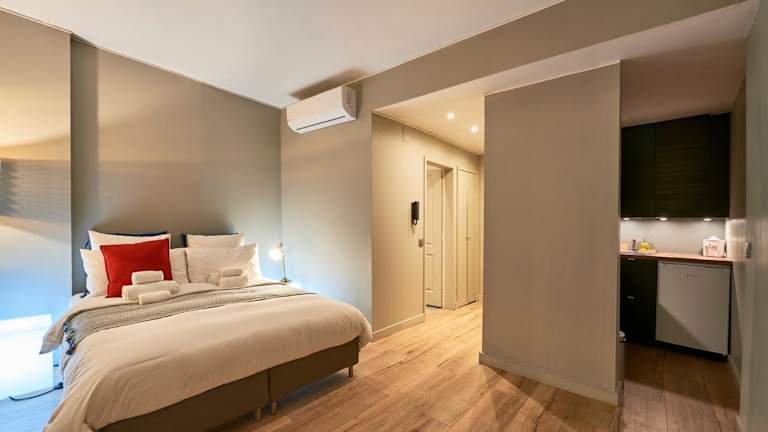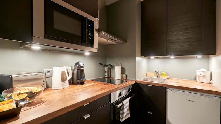 Die Apartments sind mit einer voll ausgestatteten Küchenzeile ausgestattet, die Kühlschrank, Mikrowelle, Herdplatte, Toaster, Kaffeemaschine und Wasserkocher umfasst.