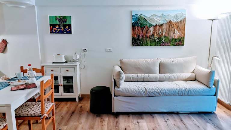 Das Apartment im Casina Alpina sugli impianti Passo S Pellegrino verfügt über ein Schlafzimmer und bietet Platz für bis zu zwei Personen. Es ist mit einem Balkon ausgestattet, von dem aus Sie einen herrlichen Blick auf den Garten genießen können. Das Apartment verfügt über eine voll ausgestattete Küche mit einem Geschirrspüler und einer Mikrowelle sowie über eine Waschmaschine für Ihre Wäsche. Kostenloses WLAN und ein Flachbildfernseher sind ebenfalls vorhanden. Handtücher und Bettwäsche werden gestellt, um Ihren Aufenthalt so angenehm wie möglich zu gestalten.