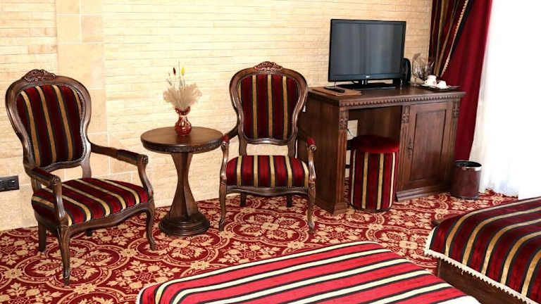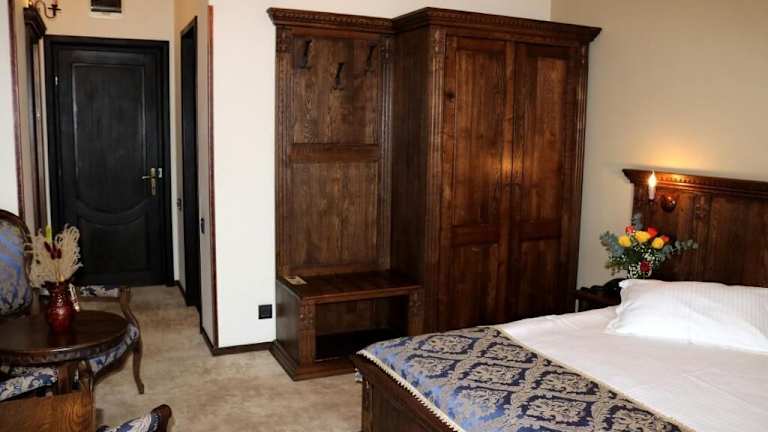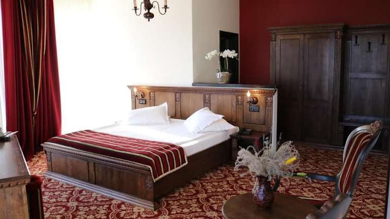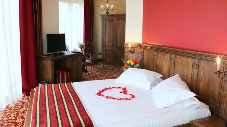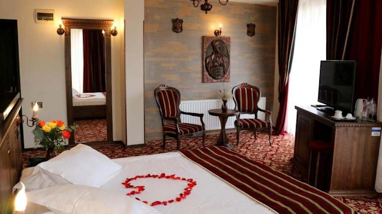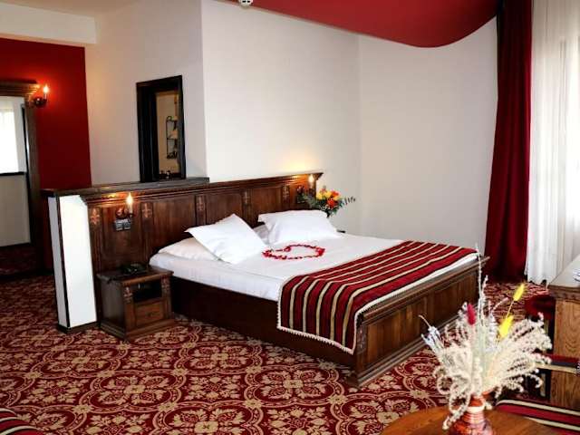 Die Zimmer im Castel Transilvania sind komfortabel und im mittelalterlichen Stil eingerichtet. Sie verfügen über einen Kamin und eine dunkelbraune und rote Einrichtung. Zur Ausstattung gehören eine Klimaanlage, ein Flachbild-Sat-TV, ein Sofa, ein Sitzbereich und ein Schreibtisch. Jedes Zimmer hat ein eigenes Bad und einige bieten auch einen Balkon oder eine Terrasse zum Entspannen.