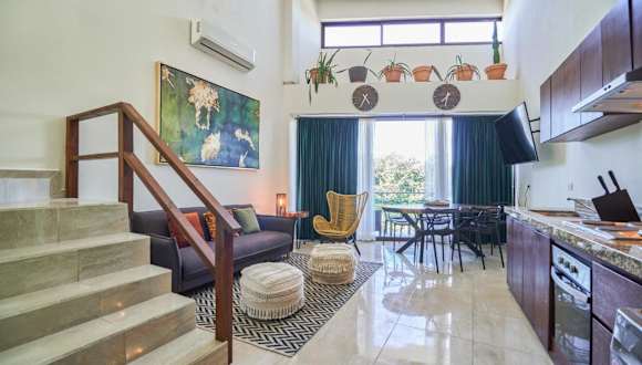 Die Cave Apartments Mexico 5 in Tulum sind eine ideale Wahl für Reisende, die eine komfortable und gut ausgestattete Unterkunft suchen. Mit kostenfreiem WLAN und einem atemberaubenden Stadtblick bieten die Apartments alles, was Sie für einen angenehmen Aufenthalt benötigen. Das klimatisierte Apartment verfügt über 2 Schlafzimmer, ein geräumiges Wohnzimmer und eine voll ausgestattete Küche. Der Außenpool und die Terrasse laden zum Entspannen ein, während Sie in der Nähe Aktivitäten wie Angeln, Schnorcheln, Windsurfen und Tauchen genießen können. Die Ausgrabungsstätte Tulum ist nur 5,3 km entfernt, und der Busbahnhof Tulum ist in 2,5 km erreichbar. Der internationale Flughafen Cozumel liegt nur 80 km von den Apartments entfernt.