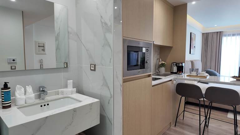 Die Wohneinheiten der CC LUX Suites sind mit einer voll ausgestatteten Küche ausgestattet, die einen Kühlschrank, eine Mikrowelle und eine Minibar umfasst. Zudem sind eine Kaffeemaschine und ein Wasserkocher vorhanden, um für die Verpflegung der Gäste zu sorgen.