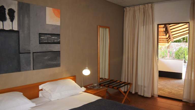 Die klimatisierten Zimmer im Central Hotel Omaruru sind komfortabel und gut ausgestattet. Jedes Zimmer verfügt über einen Schreibtisch, einen Flachbild-TV und ein eigenes Bad. Die Zimmer bieten auch eine Terrasse mit Blick auf den Pool. Bettwäsche und Handtücher werden gestellt und es gibt auch einen Kleiderschrank und eine Kaffeemaschine in jedem Zimmer.