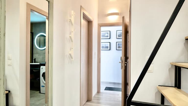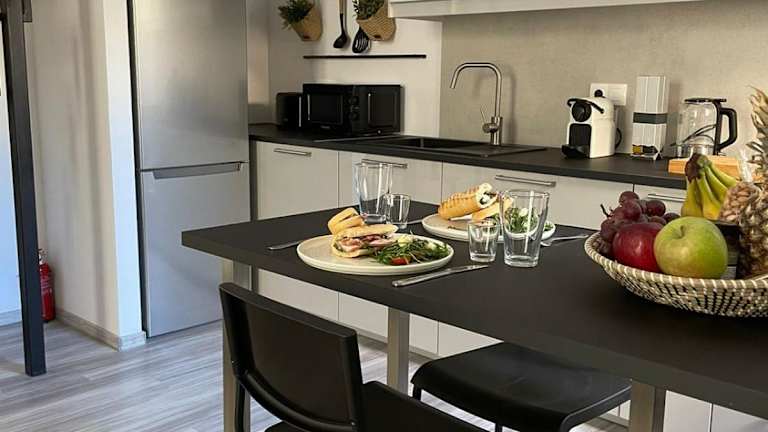 Die Ferienwohnung besteht aus einem Schlafzimmer, einem Wohnzimmer und einer voll ausgestatteten Küche, die mit einem Kühlschrank und einer Kaffeemaschine ausgestattet ist. Ein Badezimmer mit einer Dusche und einem Haartrockner ist ebenfalls vorhanden. Handtücher und Bettwäsche werden bereitgestellt.