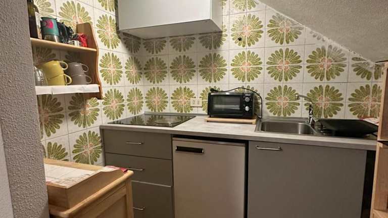 Die Ferienwohnung besteht aus einem Schlafzimmer, einem Wohnzimmer, einer voll ausgestatteten Küche mit Kühlschrank und Kaffeemaschine sowie einem Badezimmer mit Bidet und Dusche. Handtücher und Bettwäsche werden bereitgestellt.