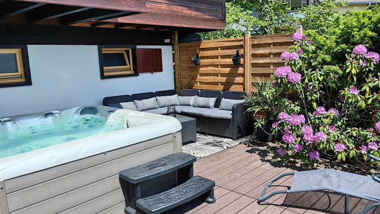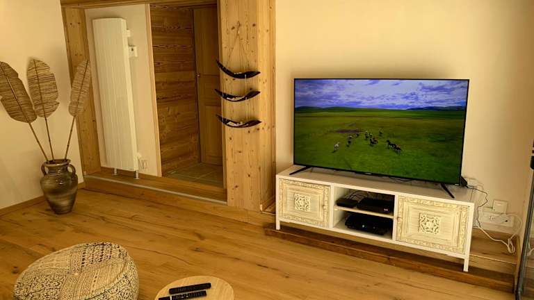 Das Chalet bietet eine gut ausgestattete Küche mit Kühlschrank, Geschirrspüler und Ofen. Es umfasst ein Wohnzimmer mit einem Sitz- und einem Essbereich sowie zwei Schlafzimmer und ein Badezimmer mit Dusche und Whirlpool. Eine Spielekonsole (PS3) sowie ein Flachbild-TV mit Kabelkanälen sind ebenfalls vorhanden.