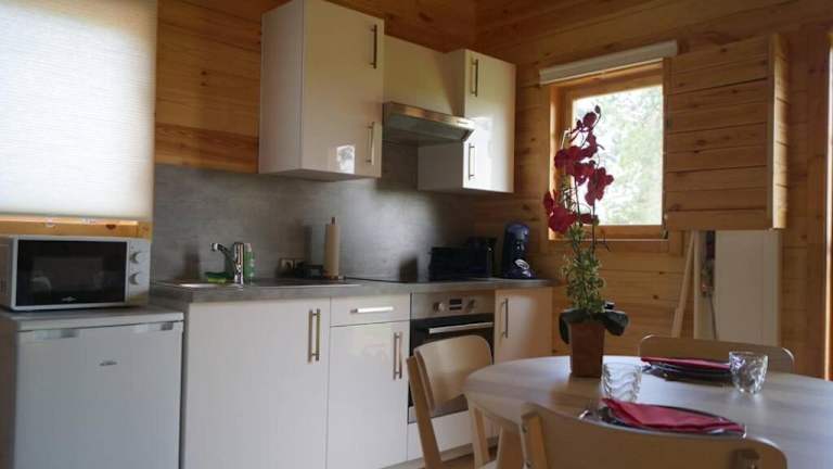Das Chalet bietet ein Schlafzimmer, ein Wohnzimmer mit kabelgebundenem Flachbild-TV, eine gut ausgestattete Küche sowie ein Badezimmer mit Dusche und Whirlpool. Zudem stehen Handtücher und Bettwäsche zur Verfügung.