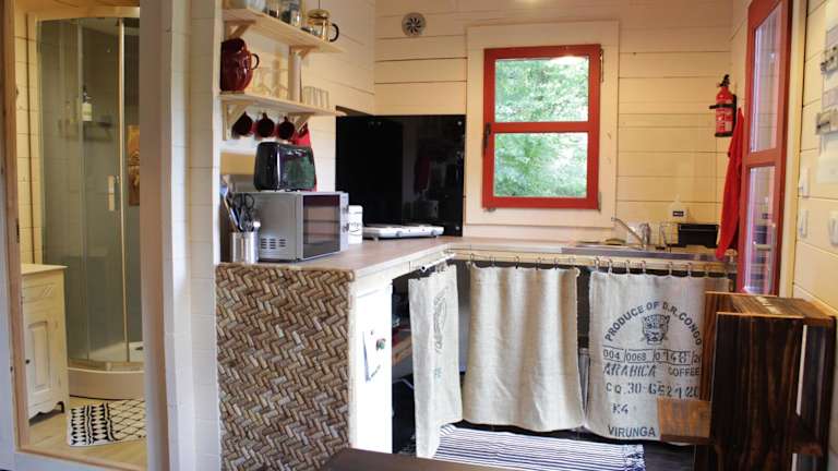 Das Chalet verfügt über ein gemütliches Schlafzimmer, in dem Sie sich nach einem ereignisreichen Tag ausruhen können. Das Wohnzimmer bietet einen komfortablen Raum zum Entspannen und verfügt über eine voll ausgestattete Küchenzeile mit einem Kühlschrank und einem Wasserkocher. Das Chalet verfügt außerdem über ein Badezimmer mit einer Dusche und einem Haartrockner. Handtücher und Bettwäsche werden im Chalet zur Verfügung gestellt, um Ihren Aufenthalt so angenehm wie möglich zu gestalten.