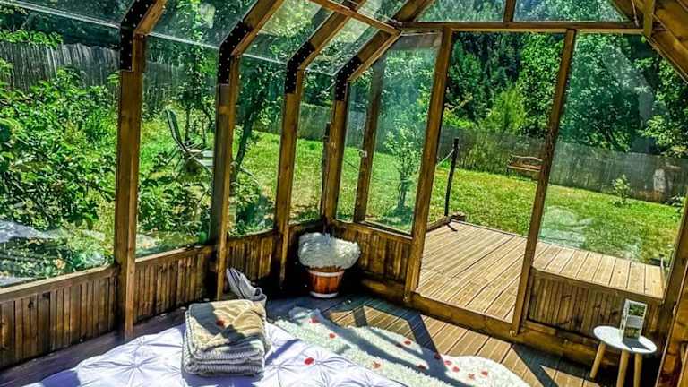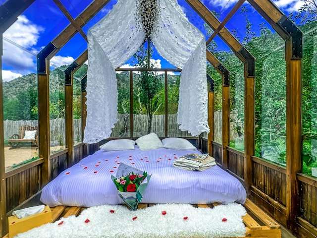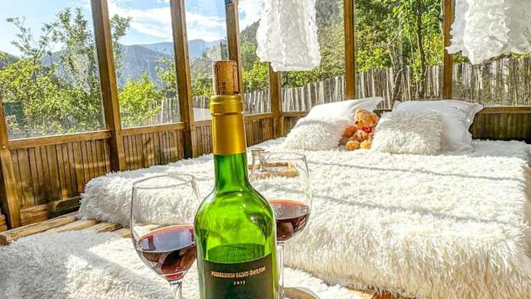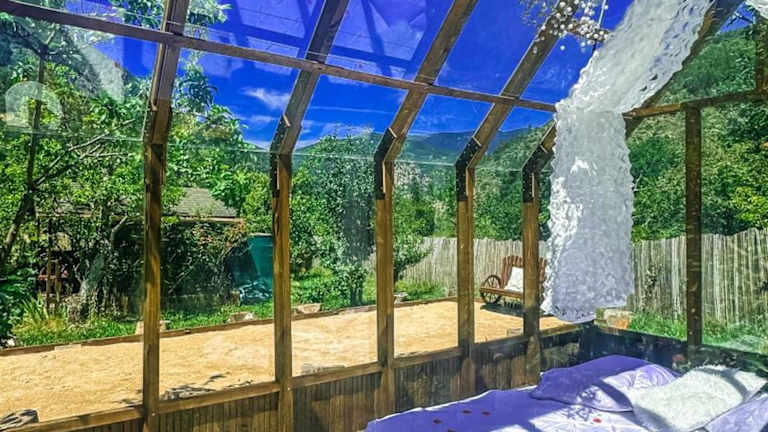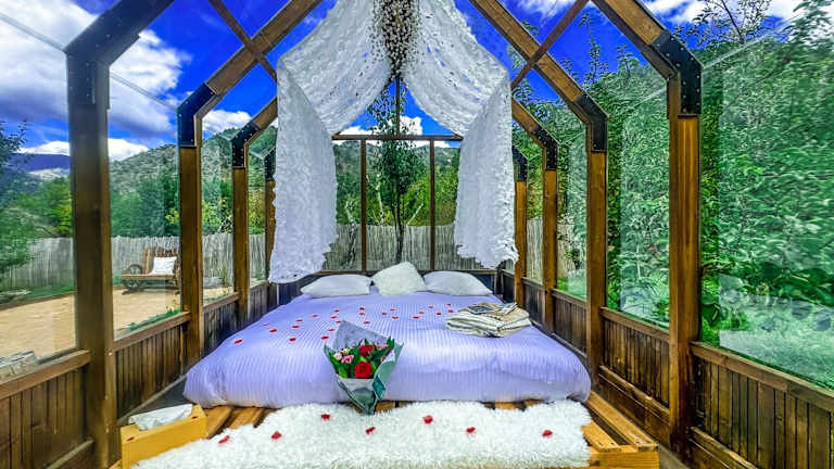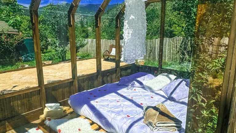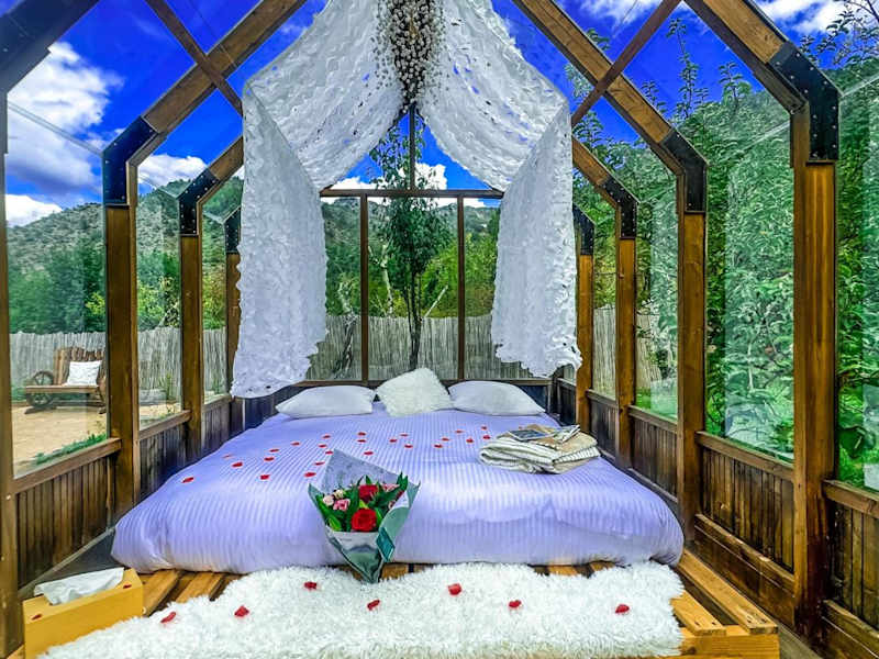 Das Chalet en verre sous une pluie étoilée bietet einen beeindruckenden Gartenblick und zeichnet sich durch eine Gartenanlage sowie eine Terrasse mit Blick auf die Berge aus. Kostenloses WLAN steht in der gesamten Unterkunft zur Verfügung.