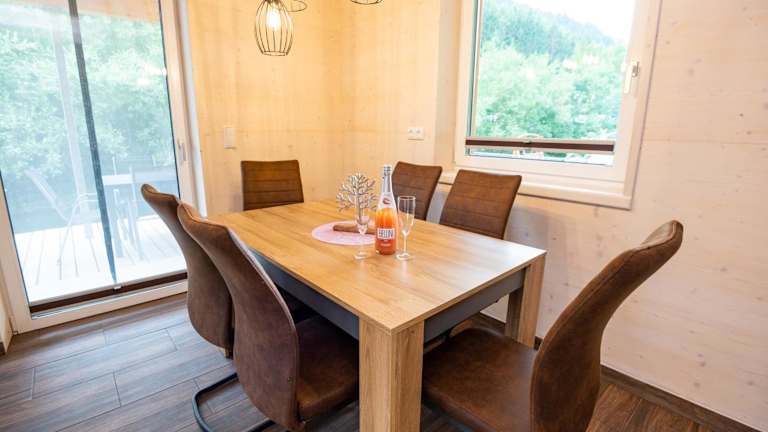 Die Chalets verfügen über eine voll ausgestattete Küche und einen Essbereich, wo Gäste ihre Mahlzeiten zubereiten und genießen können.