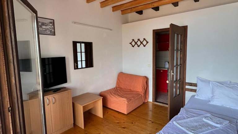Im Chardak Apartments können Sie sich selbst verpflegen und die gut ausgestattete Küche nutzen. Auf Anfrage können Sie jedoch auch Frühstück, Mittag- und Abendessen auf der Terrasse der Unterkunft genießen. Ein Lebensmittelgeschäft befindet sich nur 50 m entfernt, so dass Sie Ihre Einkäufe bequem erledigen können. Wenn Sie keine Lust zum Kochen haben, lädt ein Restaurant in 100 m Entfernung zum Verweilen ein.