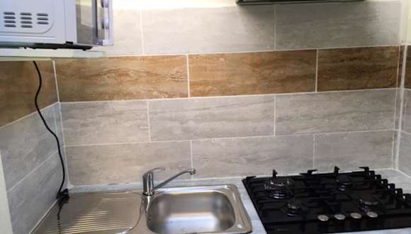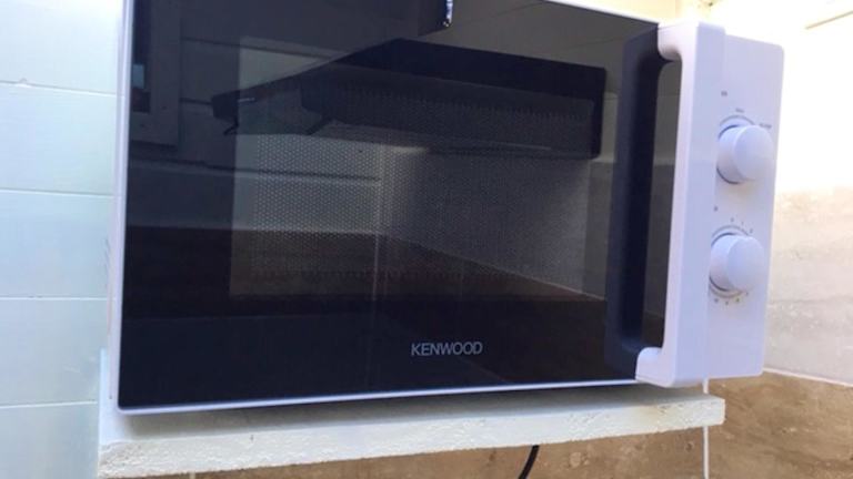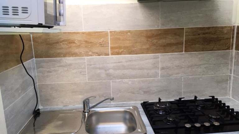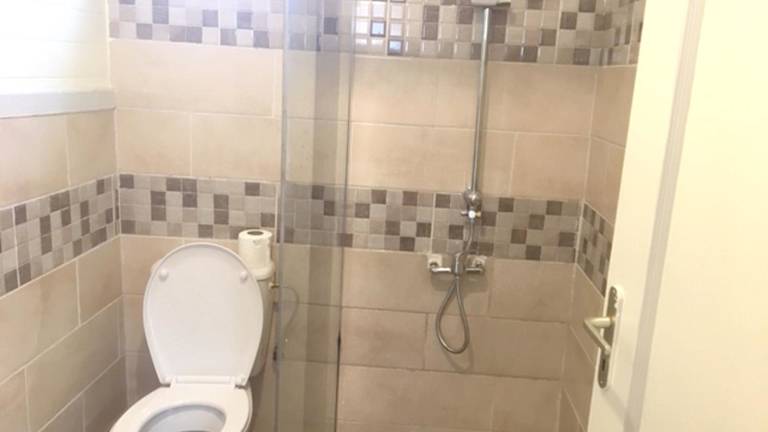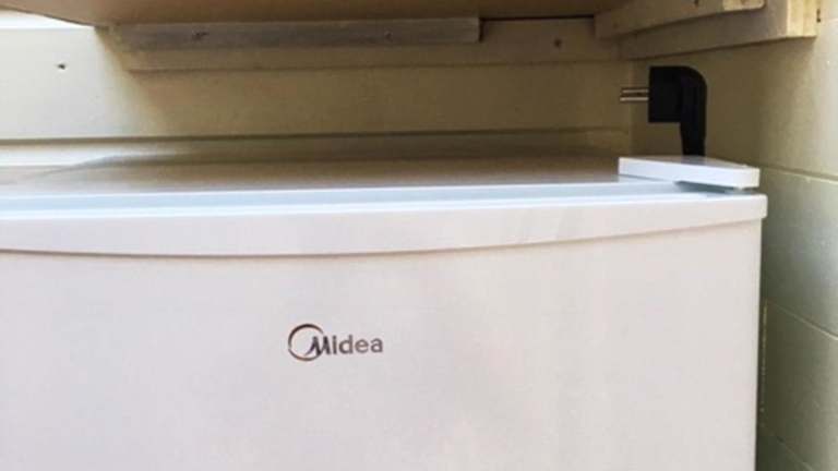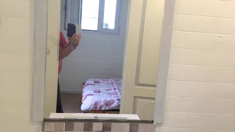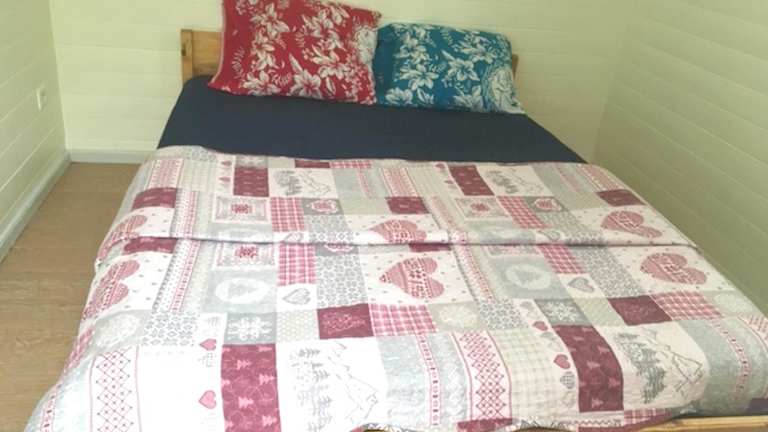 Das Ferienhaus umfasst ein Schlafzimmer, eine Küche mit Kühlschrank, einen Fernseher, einen Sitzbereich sowie ein Badezimmer mit Dusche. Handtücher und Bettwäsche werden bereitgestellt.
