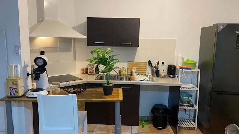 Die Ferienwohnung verfügt über ein Schlafzimmer, ein Wohnzimmer, ein Badezimmer mit Dusche sowie eine voll ausgestattete Küche mit Kühlschrank und Kaffeemaschine. Handtücher und Bettwäsche werden bereitgestellt. Die Unterkunft ist klimatisiert.