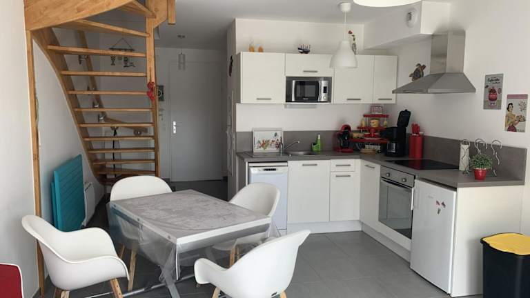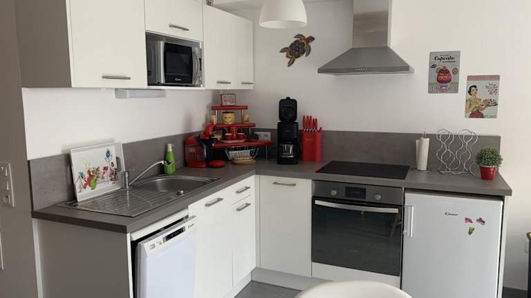 Die Unterkunft verfügt über eine voll ausgestattete Küche mit Kühlschrank und Geschirrspüler, ideal für Selbstverpflegung.
